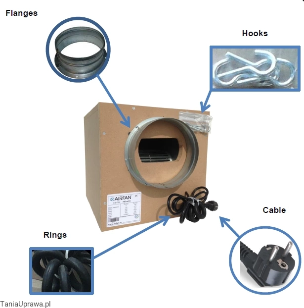Przyłącza: 2x 200mm IN / OUT Wydajność: 750m³/h Zasilanie: 230 V, 50 Hz Moc max: 330W Poziom hałasu Wymiary: 40x40x50 cm Waga: 12kg Dzięki zastosowaniu wygłuszenia od środka oraz zastosowaniu gumowych uchwytów do podwieszenia silnika wentylator pracuje bardzo cicho |
